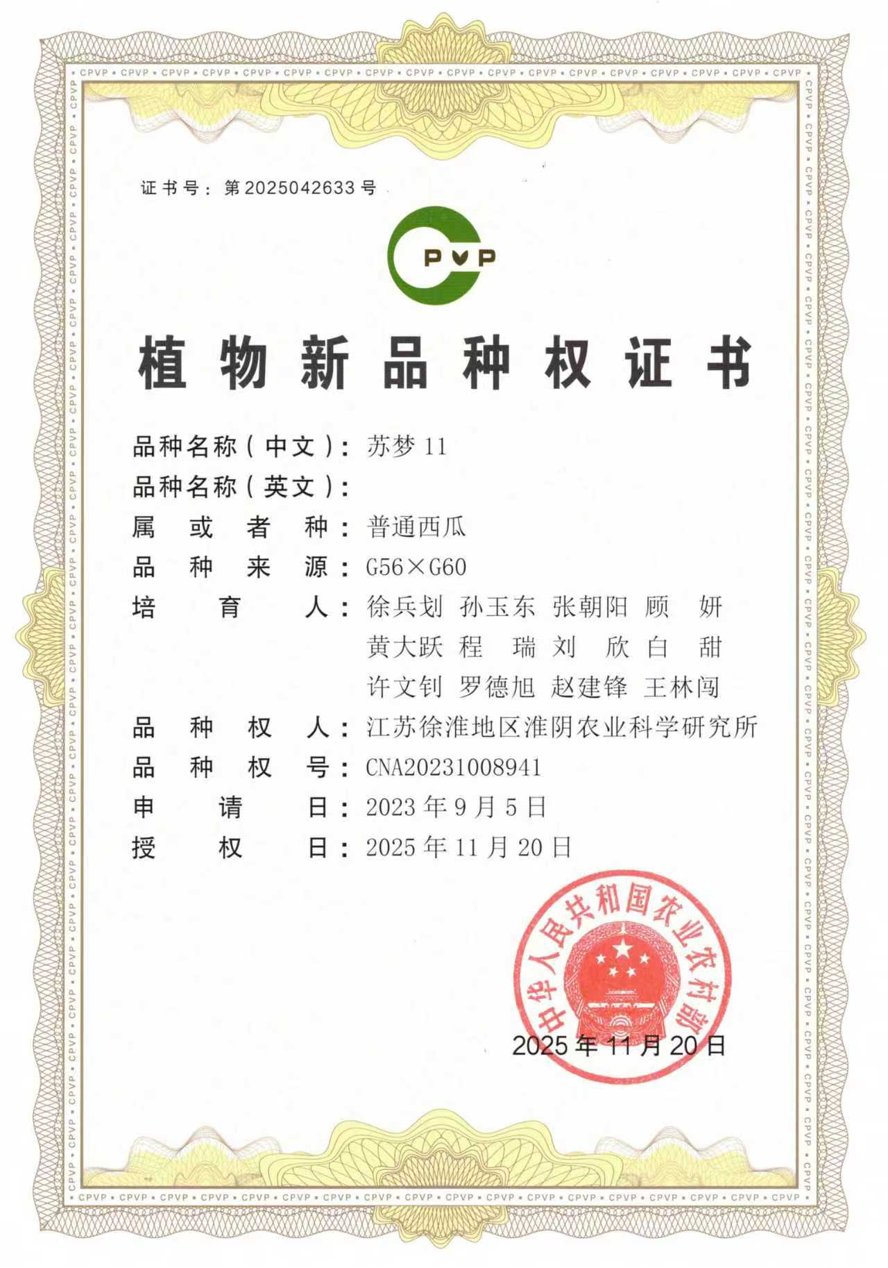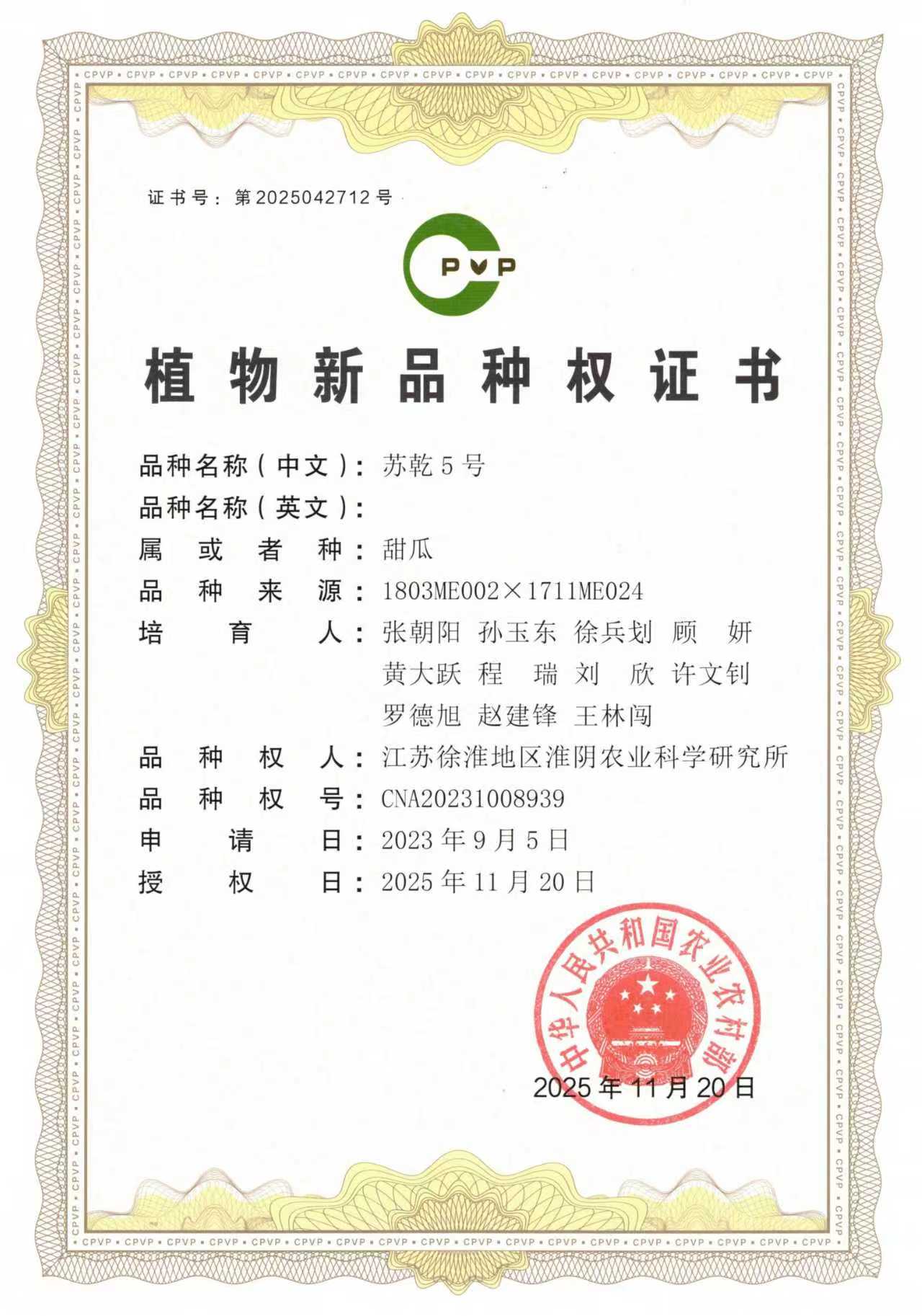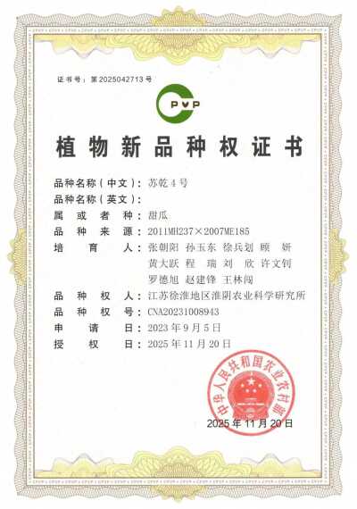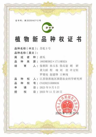 近日,我院蔬菜研究中心自主选育的西瓜新品种“苏梦10号”“苏梦11”,甜瓜新品种“苏乾4号”“苏乾5号”正式获得国家农业农村部颁发的植物新品种权证书,标志着我院在西甜瓜育种领域取得又一重要突破。