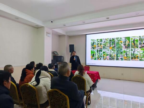培训中,许学文教授系统讲解了瓜菜绿色高效栽培技术,徐磊研究员重点介绍了生物可降解地膜的应用优势与发展前景。现场互动积极,反响热烈。淮阴丁集工作站自成立以来,先后协助丁集镇承办两届江苏黄瓜节,建成全国首个黄瓜博物馆,推动丁集镇(黄瓜)入选首批国家农业产业强镇,并助力江苏淮阴黄瓜科技小院获教育部重点支持,逐步构建起丁集黄瓜产业“科技+产业+人才”融合发展的新格局。